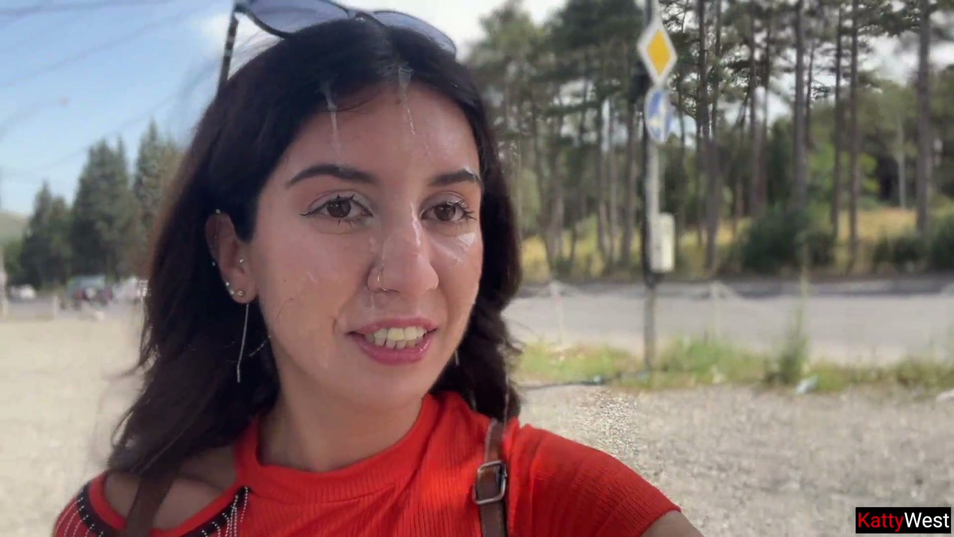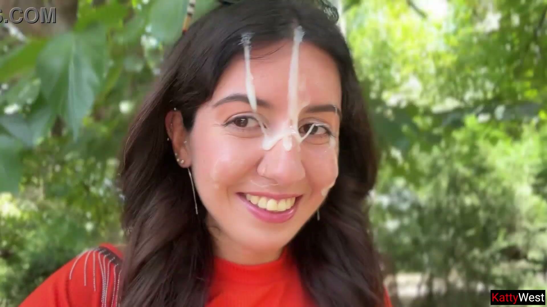 Essa safada louca leva estranho pro meio do mato e já cai de joelhos mamando o pau dele com vontade, engolindo tudo enquanto ouve barulho de gente passando perto… Boquete guloso, garganta profunda e babado no mato mesmo. Depois o cara não aguenta e explode porra quente na cara, boca e peito dela. Ela sai caminhando pela rua toda gozada, leitinho escorrendo pelo rosto, pescoço e tetas, fazendo cumwalk insano com sorriso de vadia. Exibicionismo extremo, risco total!